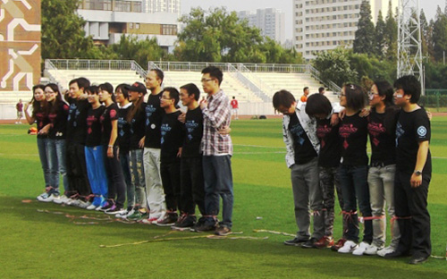 第一項:“五人六足”綁腳比賽,比賽規(guī)則為各部門為一隊,各選派5人出來,比賽綁腳競走,以速度最快者為優(yōu)勝。比賽還未開始,各班隊伍便聚集在操場上摩拳擦腳,齊步聲、加油聲此起彼落,一副蓄勢待發(fā)的樣子。隨著一聲令下,參賽隊伍腳并腳,肩搭肩,齊步的跑起來,比賽在同學(xué)們的喊叫聲中激烈的進行著。最后由教務(wù)部的團隊獲得第一。