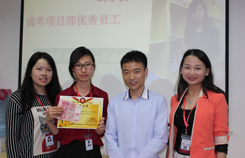 緊接著,本次工作會議暨月度表彰大會在全體員工一起唱響天資教育集團團歌——《我相信》中正式拉開帷幕。首先,天資教育集團唐總向大家匯報了上個月各個辦公室的工作情況和報讀人數(shù)。緊接著,唐總及項目總監(jiān)葉總監(jiān)和翁總監(jiān)向各個部門月度優(yōu)秀員工、前三名咨詢老師、最佳辦公室頒獎,以資鼓勵他們在接下來的工作中再接再厲。同時,各個獲獎?wù)咭步Y(jié)合自身的工作經(jīng)驗、工作感悟同大家分享。